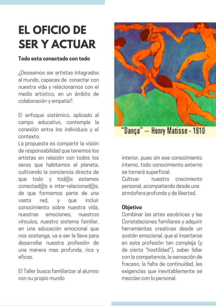 Imparte workshops de entrenamiento físico, danza-teatro, composición y creatividad.